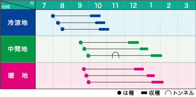 播種日や天候によって異なるが、播種後95日(12月下旬どり作型)~120日(2月初旬どり作型)で収穫期となる。