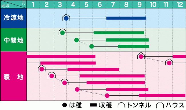 早めに圃場を選定し、土作り・排水対策等の準備を十分に行う。畝の高さは排水を考え高畝にする。畝幅は日当たり・排水・作業性などを考慮。播種の2週間前にはマルチングを行い、地温確保に努める。
