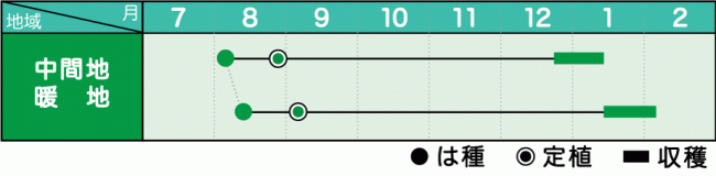 - 最適作型は8月上・中旬まき、12月下旬~1月どりで、特性を発揮する。