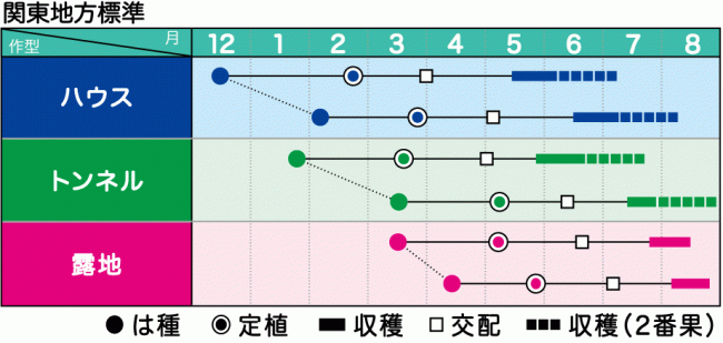 - ハウス促成栽培から露地栽培まで幅広く栽培できる。時期により異なるが5月どり栽培で40日前後、6月どりで36日前後が目安となる。