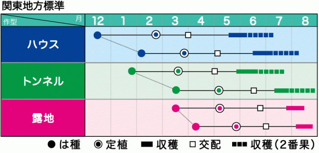 - 熟期は早生系で、5月収穫で40日内外、6月収穫で36日内外で適熟となる。
