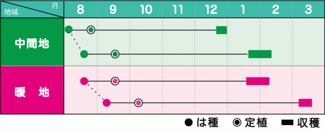 - 極端な早まきはアントシアンの発生が激しく、やや凹凸が目立つ為避け、作型図のまき時期を守る。