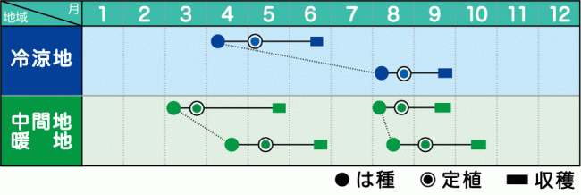 低温下では生育が停滞し、結球の恐れがあるため、低温期の栽培は避ける。