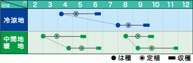 高温期は種あるいは高温期収穫の作型に適した品種です。栽培時期に注意して下さい。