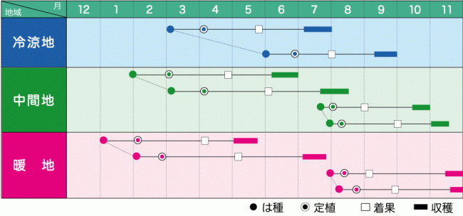 - ハウスや大型トンネルの春作および抑制栽培に向く。