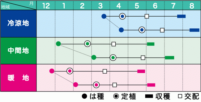 発芽適温は27℃前後、発芽後は育苗ポットに移植し、徐々に低温に慣れさせていく。栽培時期によって異なるが、発芽後30日前後で定植できる苗になる。