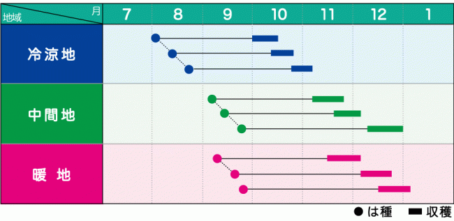 - 生育日数は適温期で、播種後65日内外で収穫となる。適期収穫を心がける。