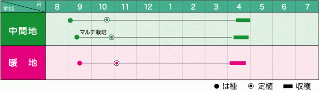 一般的な畝幅150cm(通路30cm)に5条植、株間15cmにして10a当たり約20,000本の植え付けが標準。早出しのマルチ栽培ではホーリーシートNo.3515, No.9515を使用。